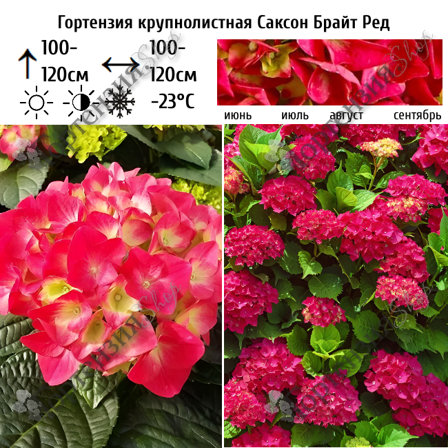 Гортензия крупнолистная 'Саксон Брайт Ред' (серия Saxon) цветущий кустарник высотой до 100-120 см и шириной до 100-120 см. Листва глянцевая тёмно-зелёная, осенью красно-бордовая. Побеги крепкие прямостоящие. Цветёт обильно всё лето на прошлогодних побегах и побегах текущего года. Цветки эффектные, звездчатые. Соцветия диаметром до 15 см., красные. Цветение с июня по сентябрь. Подходит для одиночных и групповых посадок а также для выращивания в контейнере. На зиму требуется укрытие.