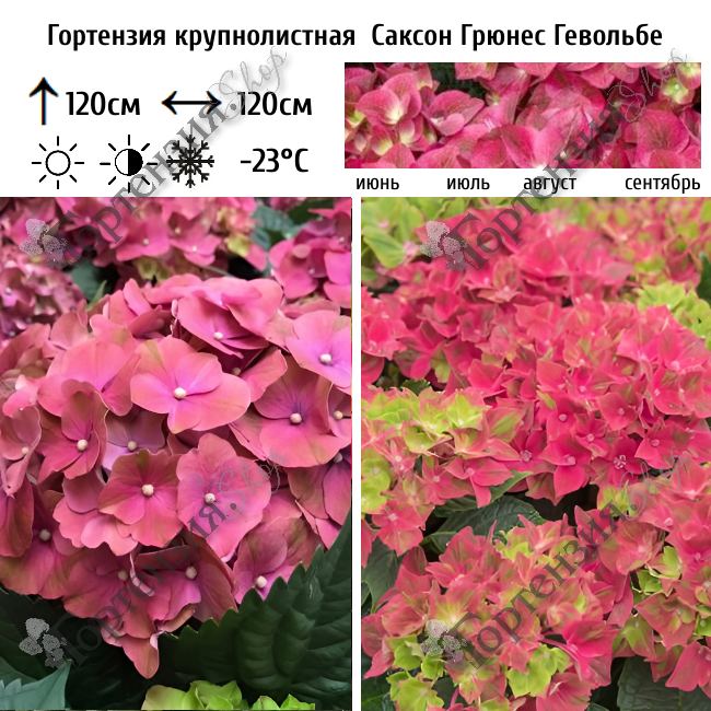 Гортензия крупнолистная 'Саксон Грюнес Гевёльбе' (серия Saxon)  цветущий кустарник высотой до 120 см и шириной до 120 см. Листва глянцевая тёмно-зелёная. Побеги крепкие прямостоящие. Цветёт обильно всё лето на прошлогодних побегах и побегах текущего года. Цветки эффектные, ярко розовые, с небольшой зеленой штриховкой на лепестках. Соцветия шарообразные диаметром до 15 см. Цветение с июня по сентябрь. Подходит для одиночных и групповых посадок а также для выращивания в контейнере. На зиму требуется укрытие.