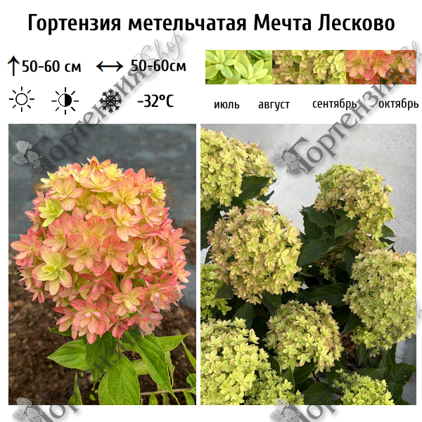 Гортензия «Мечта Лесково»-компактный куст, высотой может достигать 50-60 см. Ширина куста 50-60см к 4-5 годам. Форма куполообразная, слегка раскидистая. Побеги прочные, жесткие, весной оливкового цвета, к осени становятся коричневыми. Лист зеленый, гладкий, не опушенный, ланцетовидной формы, 6-7 см длиной. Соцветие состоит стерильных махровых цветков, плотной, округлой, широкопирамидальной формы, размером 15-20 см. Цветение с середины июля и до середины октября. В начале цветения имеет оттенки палево-зеленого, затем появляется розовая кайма, которая постепенно заполняет весь лепесток, но серединка долго остается светло-зеленой. Во время цветения не выгорает. Морозостойкость до – 32 градусов, не требует укрытия на зиму.