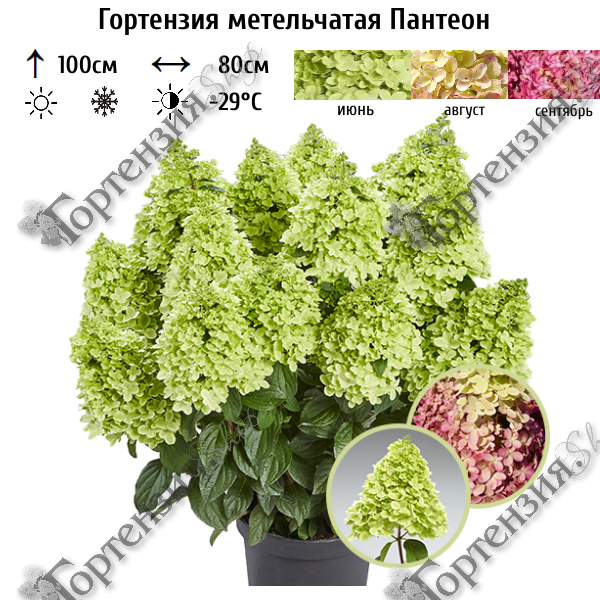Гортензия метельчатая ‘Пантеон’ (Pantheon) — это эксклюзивная серия патио немецкой селекции PAN. Шикарный, компактный куст высотой до 100 см. Изысканные соцветия плотные, конические, гигантского размера (до 40 см). Меняют цвет с лимонно-белого в начале цветения на пурпурный к осени, прекрасно контрастирующий с темной листвой куста. Это самая тёмная гортензия из всей PAN-серии. Зацветают в июне и обильно цветут до октября, неприхотливы в уходе. Сорт зимостойкий. Прекрасно смотрится как отдельно стоящий куст, так и в составе групп, создавая эффектные цветники.