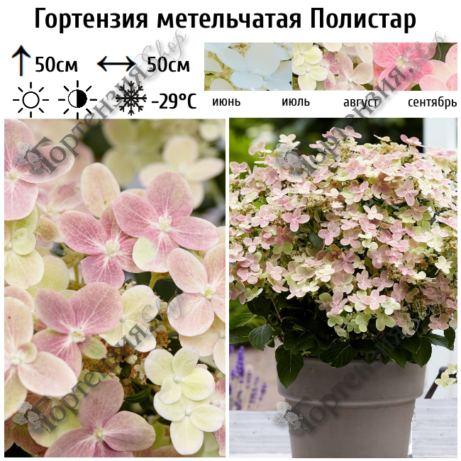 Эта крошка Полистар (Polestar) одна из самых раннецветущих гортензий, начинается цветение в июне и продолжает до самого сентября. Ультракомпактный сорт высотой и шириной 50 см. Форма соцветий округлая Листья мелкие, тёмно-зелёные, с зубчиками по краям. Цветки очень оригинальные и элегантные, сначала они зеленовато-белые, затем окрашиваются в лососёво-розовый, и уже ближе к сентябрю приобретают более насыщенный розовый окрас. Предпочитает солнечные места для посадки, но может прекрасно себя чувствовать в ажурной полутени.