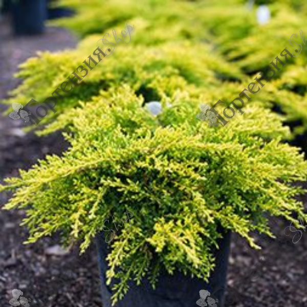 Можжевельник средний Олд Голд (Juniperus x pfitzeriana Old Gold) - один из лучших сортов можжевельника с золотистой листвой. Благодаря яркой окраске и плотной плоской кроне, остается высокодекоративным круглый год. Ежегодный прирост составляет 5-7 см в высоту и 15-20 см в диаметре. В 10-летнем возрасте растение достигает высоты 0,5 м, и ширины 1 м, позже достигает высоты 1,5 м и диаметра кроны до 2,5-3 м. Хвоя золотистая, чешуйчатая, с бронзовым оттенком, не теряет свой цвет в течении всего года
