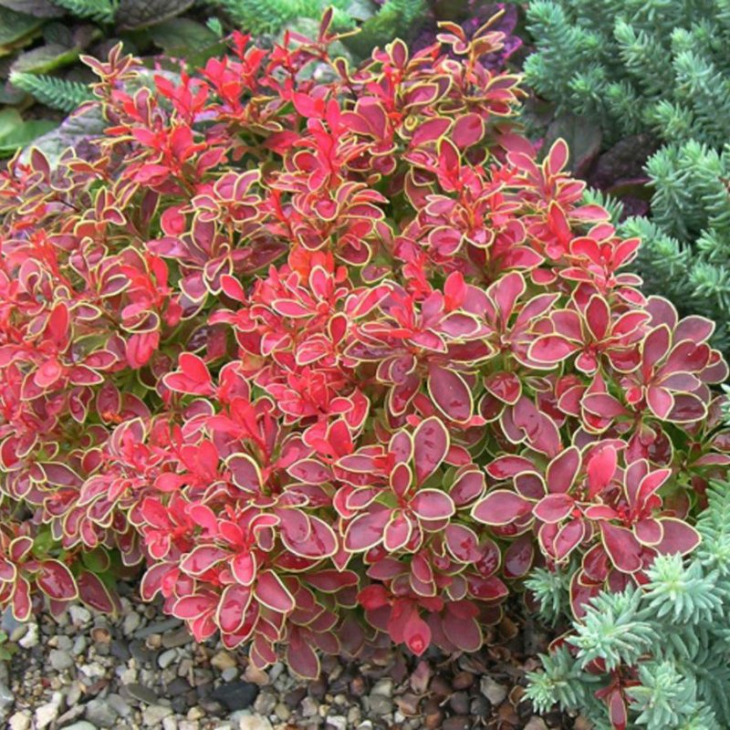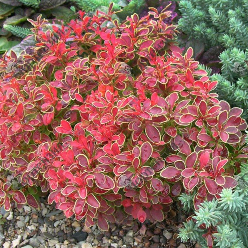 Барбарис Тунберга (Berberis thunbergii) 'Адмирейшн' - низкий кустарник, который достигает до 60 см, в высоту и до 90 см., в окружности. В первое время крона этого растения небольшая и имеет сферическую форму. Однако со временем кустарник разрастается. Листья у него небольшие, размером до 2 сантиметров, к тому же обрамлены желтой каймой. Цветы окрашены в красный оттенок и начинают появляться в начале мая. Они собираются в небольшие соцветия по 3-4 штуки. В это время куст выглядит особенно красивым. Уже осенью на месте цветов появляются горьковатые ягоды красного цвета.