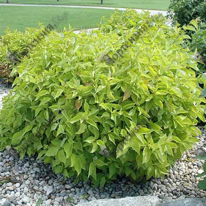 Дерен Ауреа - Кустарник высотой до 2 м, листья полностью жёлтые, цветки белые, собраны в щитковидные соцветия, цветёт почти всё лето, плоды белые с cиневой, морозоустойчив, место солнечное, к почвам нетребователен, но предпочитает сырые места.