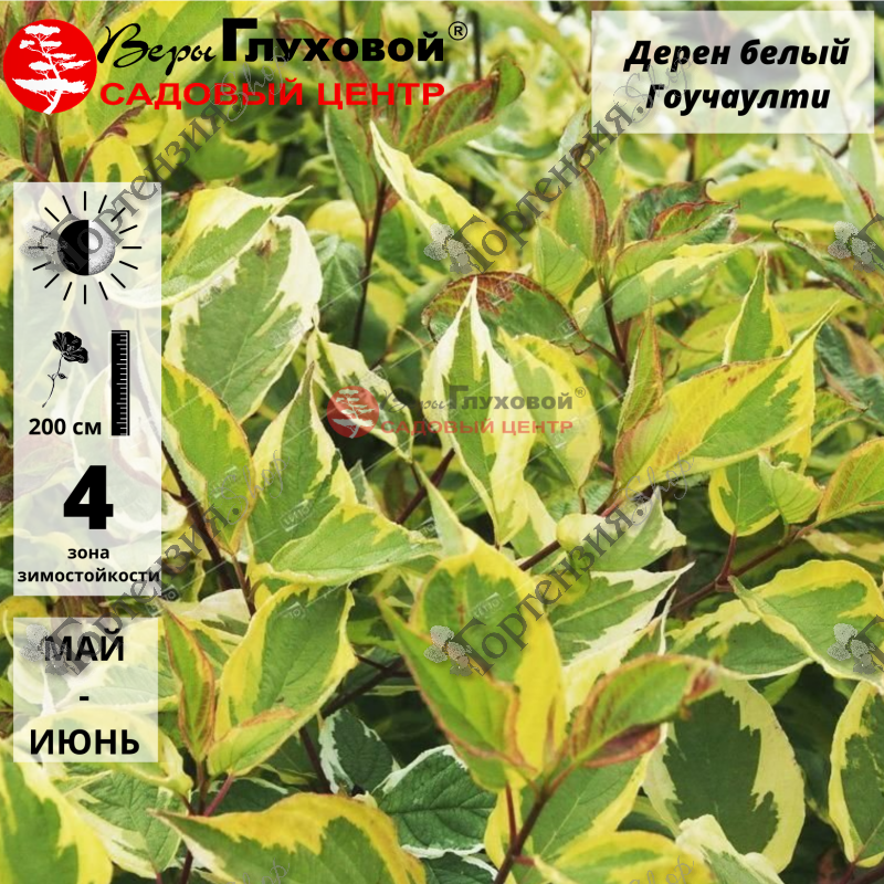 Дерен белый (Cornusalba) Гоучаулти- неприхотливый, листопадный кустарник семейства Кизиловых. Куст компактный, прямостоячий. Побеги ровные, в возрасте дугообразно изогнуты, красноватых (весной - яркие красные) оттенков. Лист яйцеобразный, край заостренный 10 см, ширина 7 см, черешкокороткие, светло-зеленый сверху, по краю неровная кайма желтой окраски с розовым оттенком. Цветки белой, чуть голубоватой окраски, соцветие щиток. Плод костянка, несъедобный. Зона зимостойкости 4.