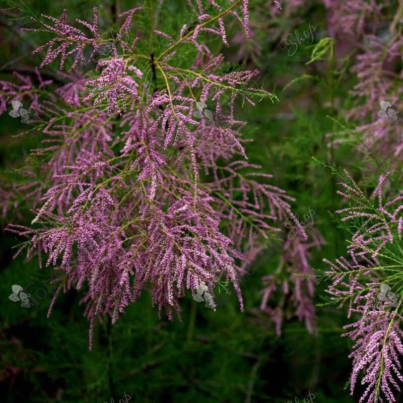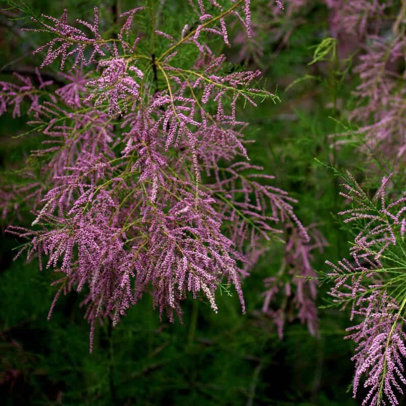 Тамарикс четырехтычинковый (Tamarix tetrandra) - светолюбивые, красивоцветущие кусты с ниспадающими до самой земли ветвями. Высота до 3 м. Ежегодный прирост 20 см. Крона раскидистая. Листья зеленого цвета. Соцветия сформированы кругообразными бутонами, напоминающими бисер. Цветы мелкие, белого или розового окраса. Светолюбив, плохо выносит даже легкую полутень (гибнут даже при затенении). К почве нетребователен. Морозоустойчив и неприхотлив.