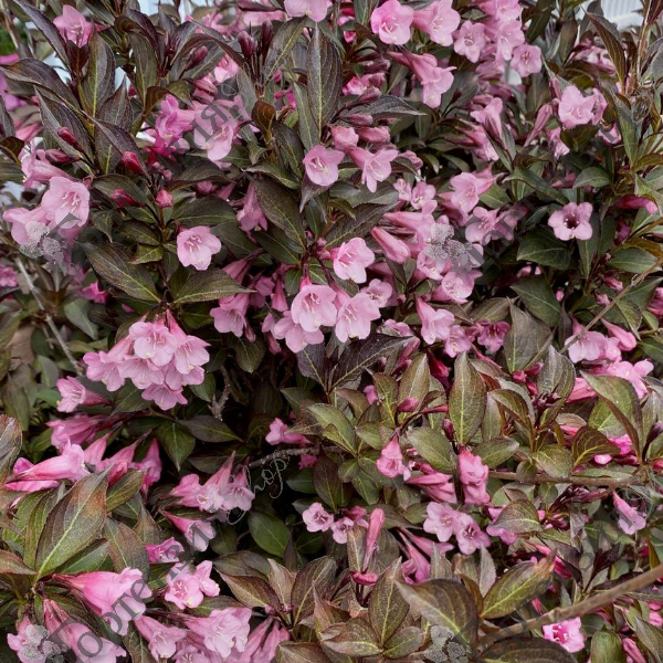 Вейгела цветущая Винтаж Лав (Weigela 'Vintage Love' ) Кустарник, высота 1,2 м, листья бордово-зеленые, заостренные, цветки розовые, цветёт в начале июня на прошлогодних побегах. Цветки трубчатые, образованы 5-ю лепестками, напоминают вытянутые колокольчики. Образуют соцветия  по 3 – 4 штуки в каждом. Источают приятный аромат. Место солнечное или полутенистое. Лучше всего подходят влажные хорошо дренированные и плодородные участки. Молодые побеги красно-бурые, зрелые - коричневые.